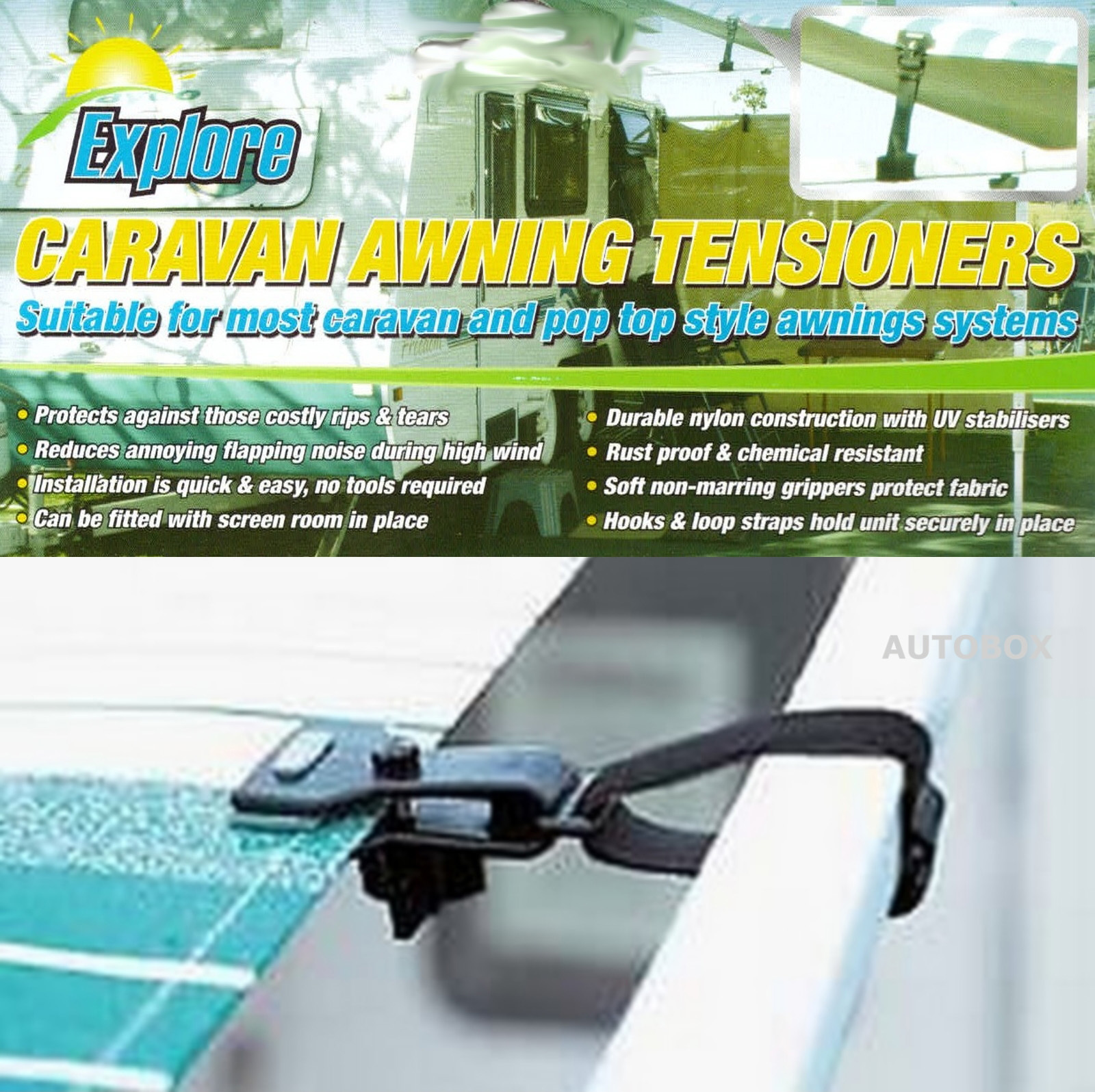 Helps prevent costly rips and tears caused by flapping awnings during high winds. Quick & easy to install they won't damage the fabric. They are rust proof, chemical resistant and UV stabilized Each pack supplied with straps that suit both Pop-top and fixed roof caravans