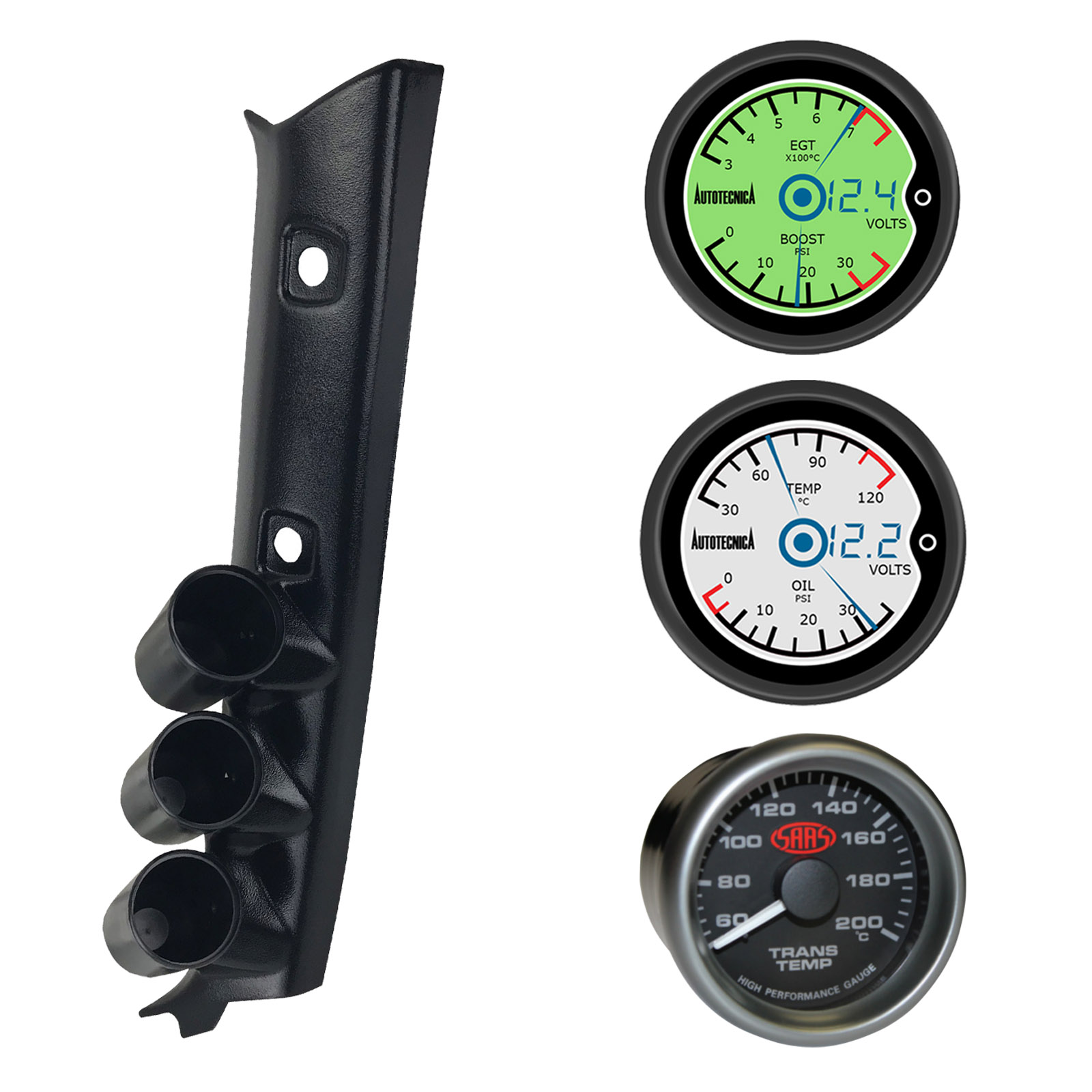 SAAS 3 Gauge Pillar Pod with Autotecnica 3 in 1 LCD Digital Gauge and SAAS 60-200C Transmission Oil Temp