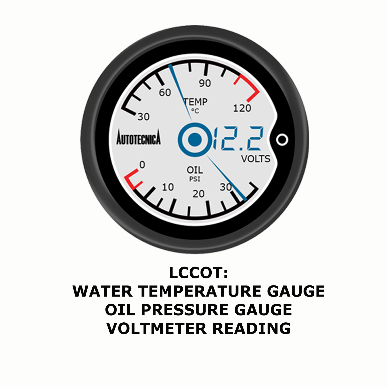 - 1x Autotecnica 3 in 1 LCD Gauge (Water Temp, Oil Press, & Volts).