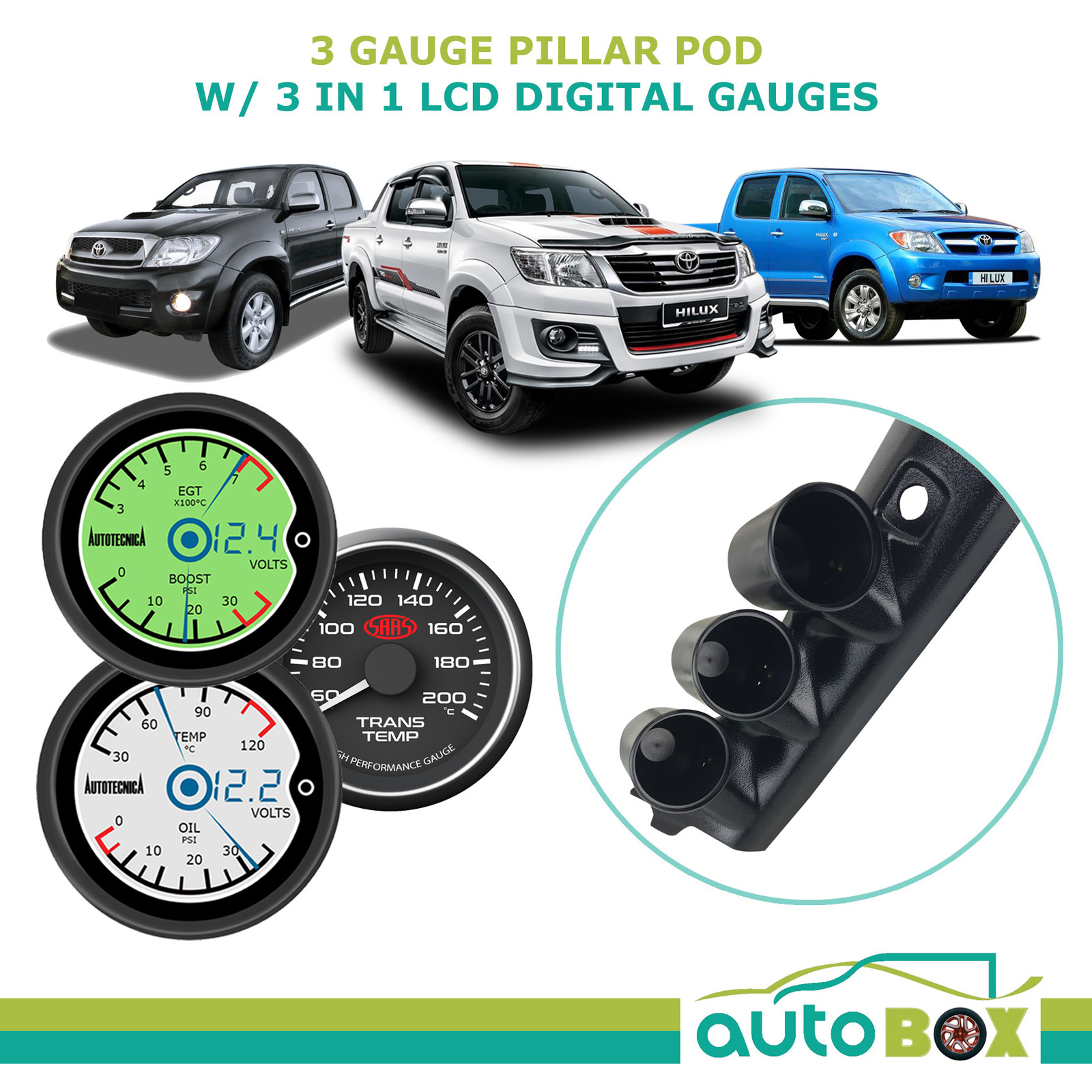 3 Gauge Pillar Pod for Toyota Hilux 2005-15 LCD Boost Exhaust Volts Oil Water