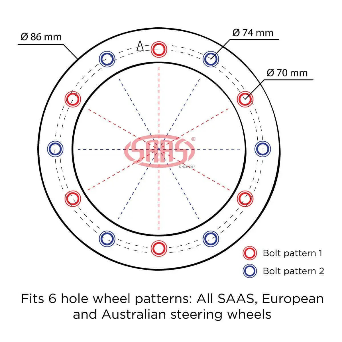 - Suits 6 stud wheels that are either 70mm or 74mm PCD. Eg: SAAS; Autotecnica; Momo; Nardi