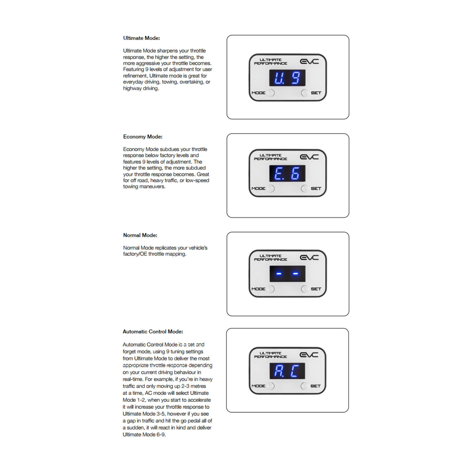Sets the EVC apart from other throttle controllers. AC automatically chooses the ultimate throttle response based on the amount of pedal pressure. Great for long drives or when towing over varying terrains.