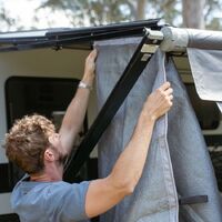 If you have an Aussie Traveller Anti-Flap Kit this screen also includes 6mm Kedar rope so it can be attached to your awning along the sail track, or no more than a few minutes to install, simply using the velcro straps to attach to the upper awning arm and then pegging down with the supplied pegs & ropes.