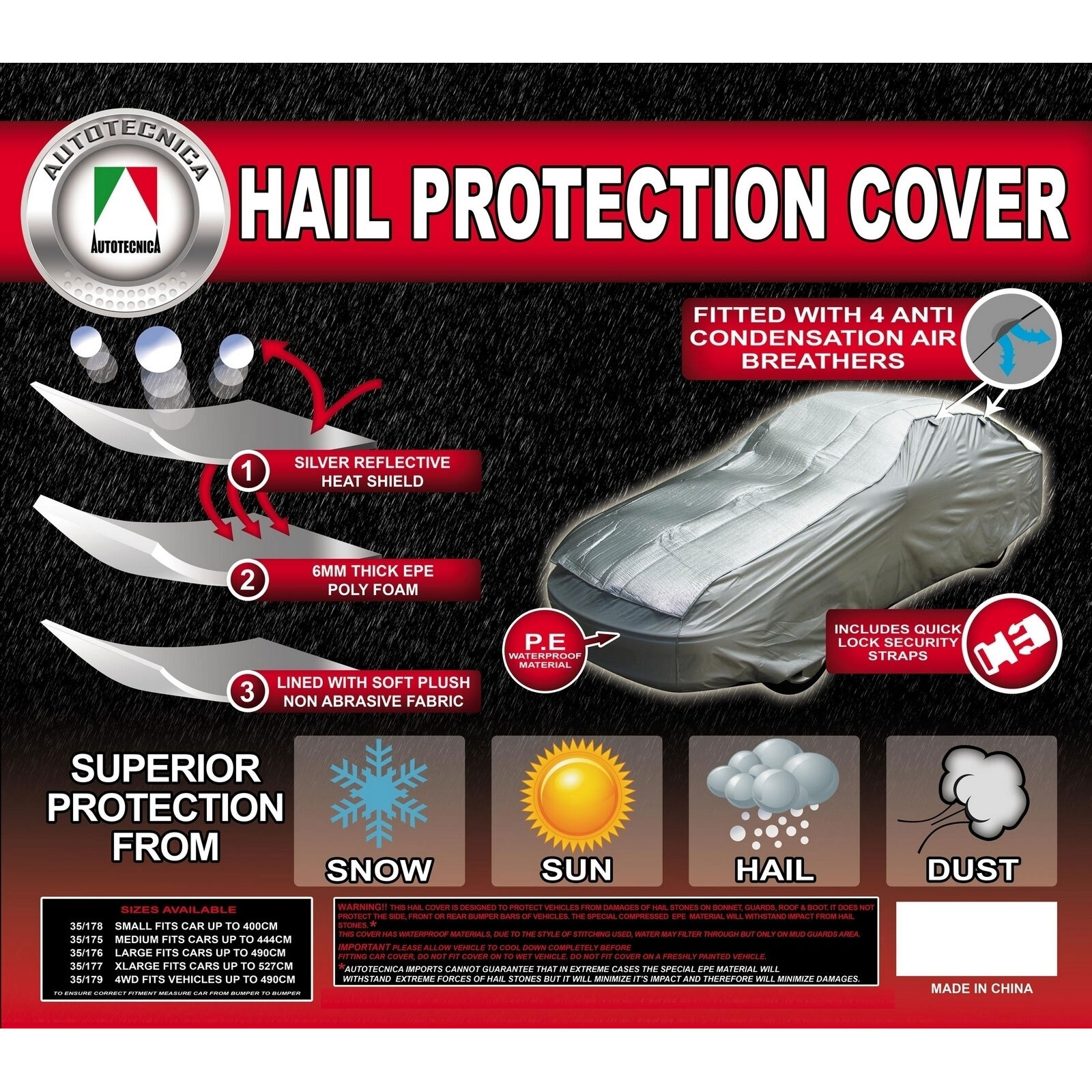 Hail cover is designed to protect vehicles from hail stones on a bonnet, guards roof and boot. It may not protect the sides, front and rear bumpers from hail stones