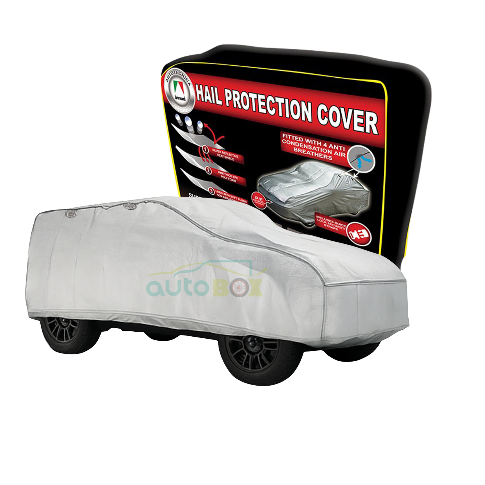Hail cover is designed to protect vehicles from hail stones on a bonnet, guards roof and boot. It may not protect the sides, front and rear bumpers from hail stones