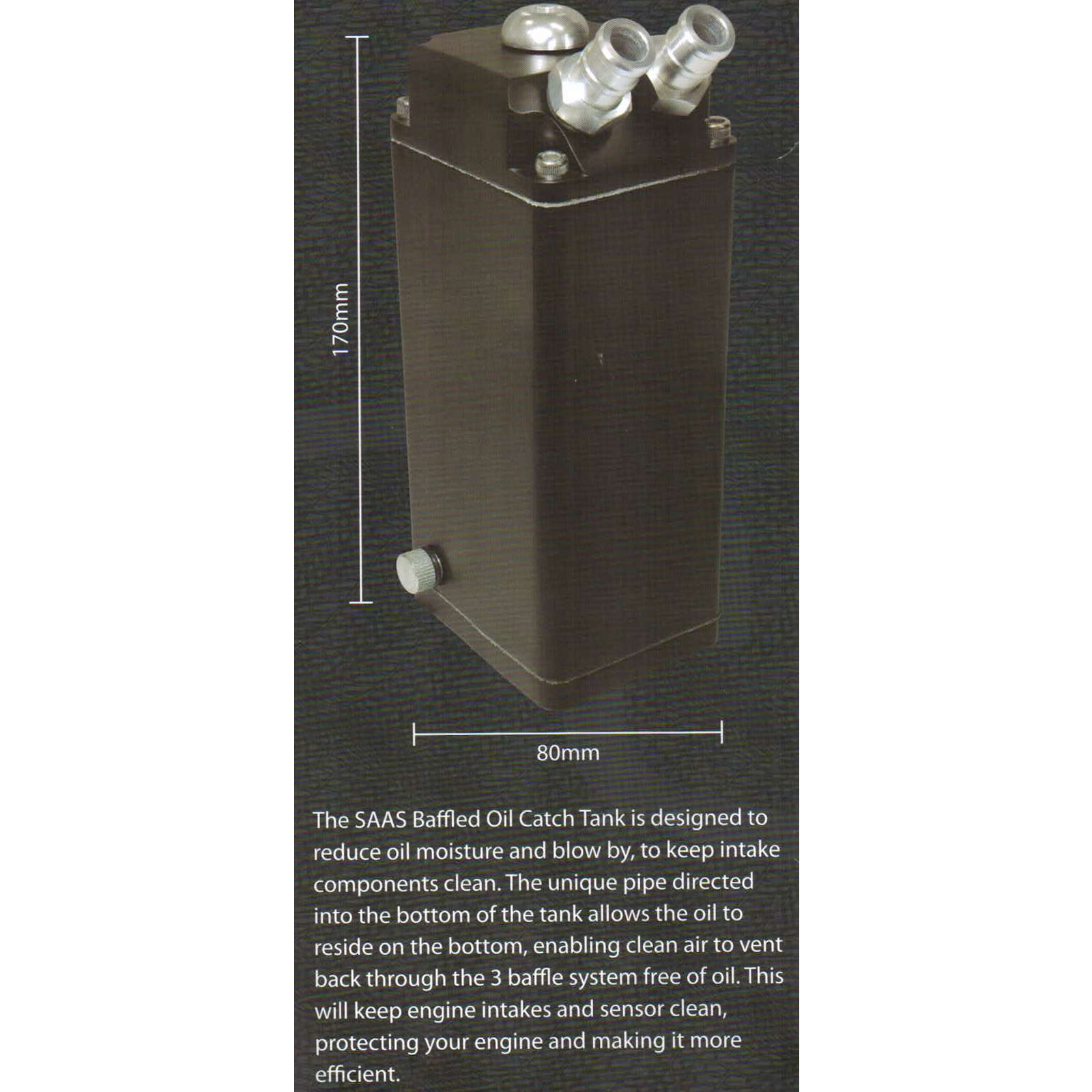 - Baffled Oil Catch Tanks are designed to reduce oil, moisture and blow-by gas to keep intake components clean.