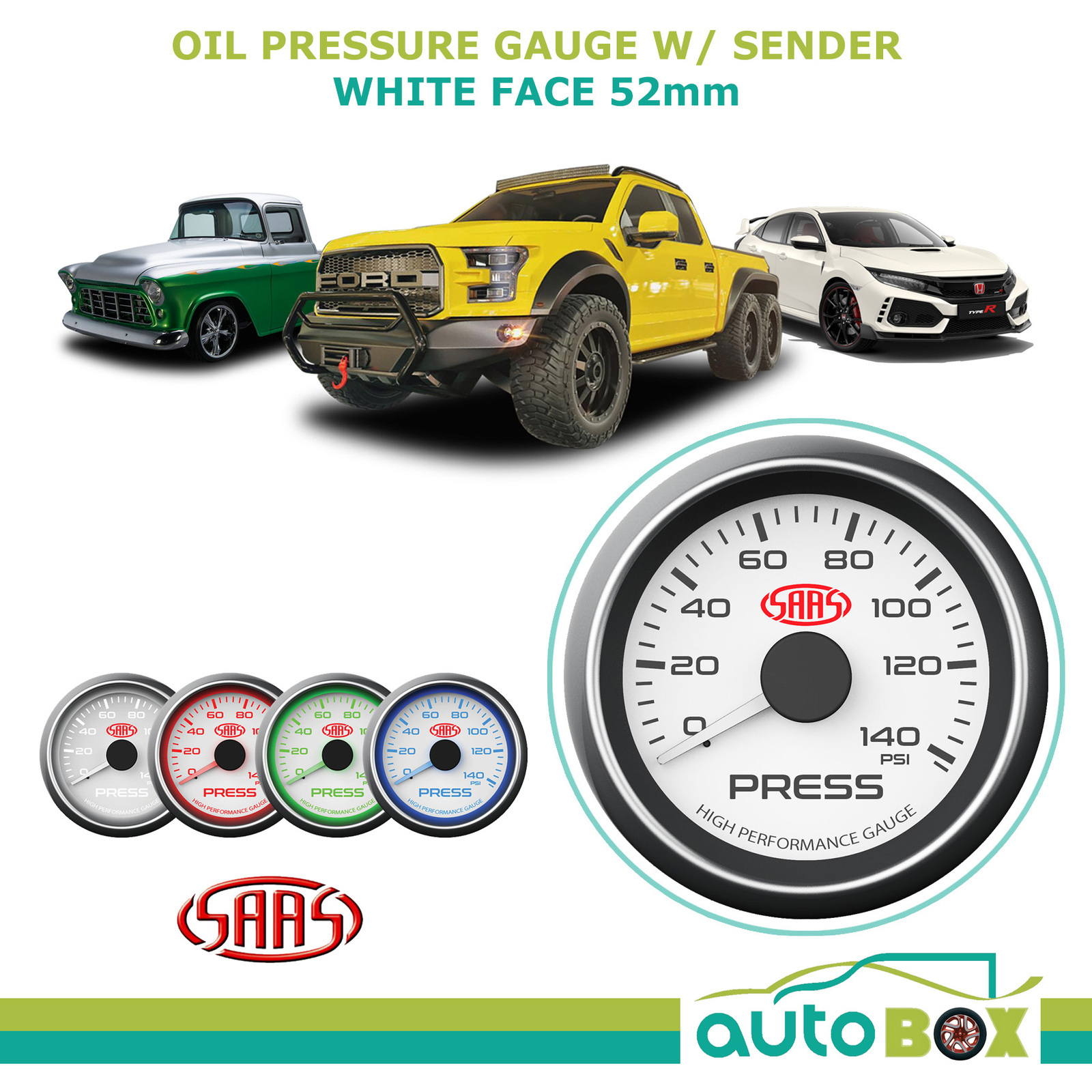 SAAS OIL PRESSURE 0-140PSI 52MM GAUGE WHITE FACE including sender 4 Colour