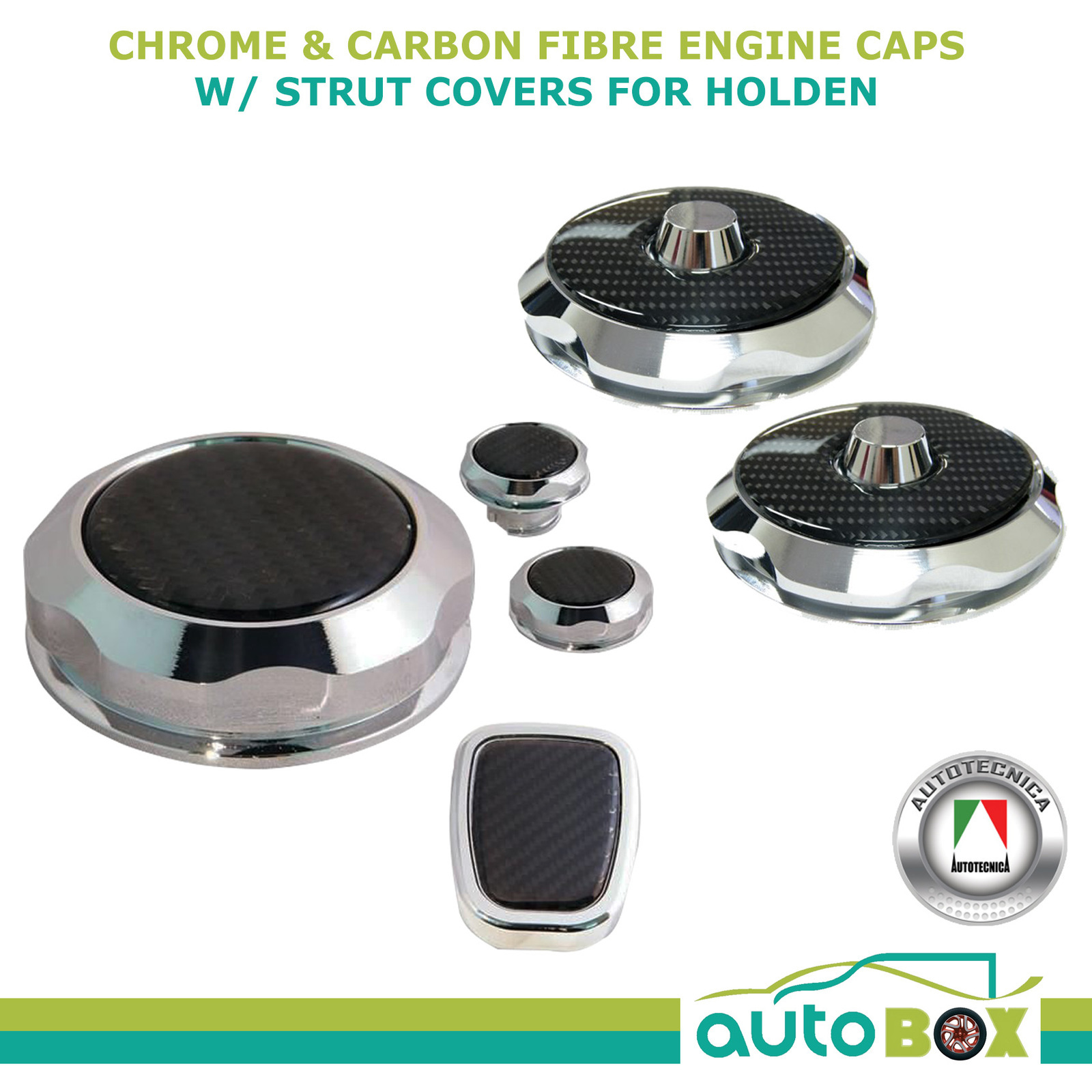 SET OF 4 Chrome (look) Billet and Carbon Dress Caps, PLUS 2 Strut Tower Covers from AUTOTECNICA STYLING RANGE